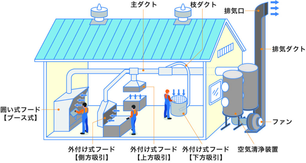 局所排気装置は、蒸気が拡散する前に発生源の近くで捕集して排気するため、全体換気よりも高い効果が期待できます。重要なのは、フードの形状や設置位置、気流の向きが作業内容に合っていることです。