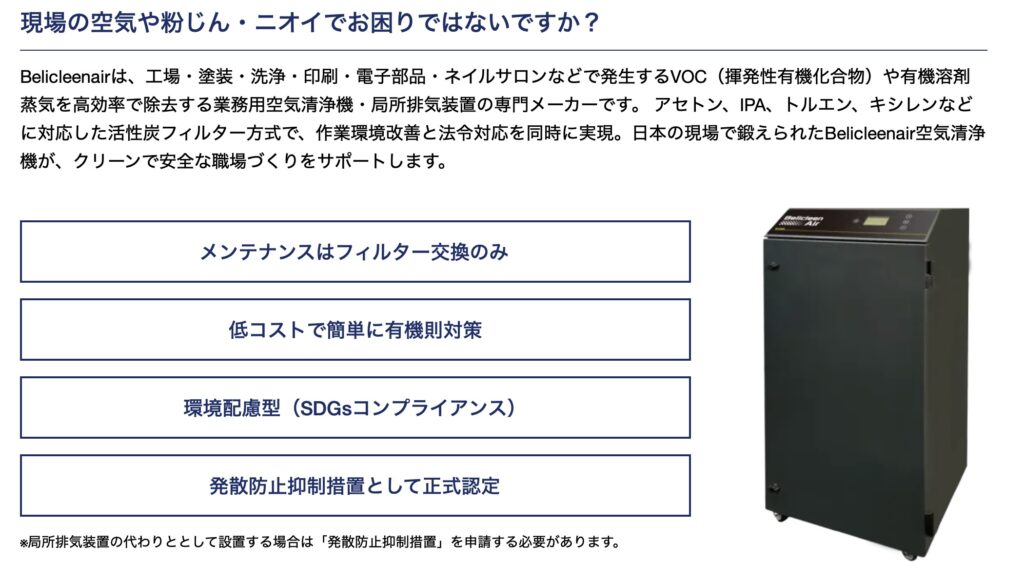 株式会社ベリクリーンの発散防止抑制装置なら、局所排気装置よりも安価で導入できます。